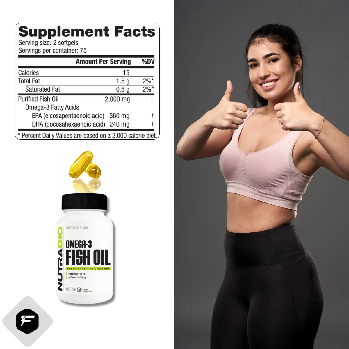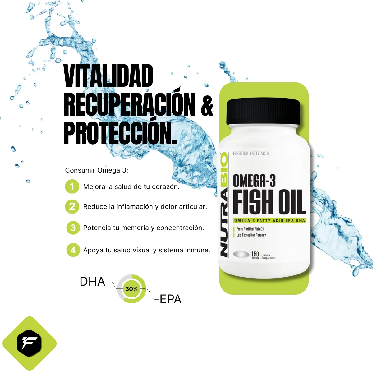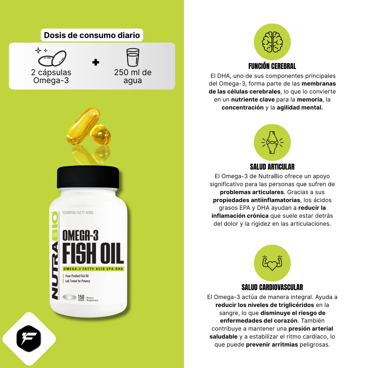 Cuida tu corazón, cerebro y articulaciones con Omega-3 Fish Oil Nutrabio 150 cápsulas. Ácidos grasos esenciales para tu bienestar diario.