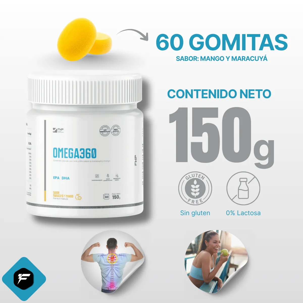Omega360 FWP: Suplemento premium en gomitas con EPA + DHA, Curcumina e Inulina para cuidar tu corazón, mente y articulaciones. Sabor maracuyá y mango, libre de gluten y metales pesados.