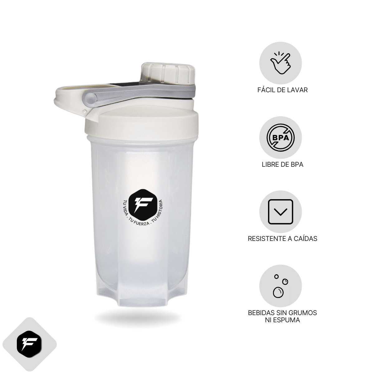 Con un diseño moderno y una estructura compacta, el Shaker FytritionPro® es ideal para llevar al gimnasio, oficina, universidad o viajes, ocupando poco espacio y asegurando comodidad en cada uso.